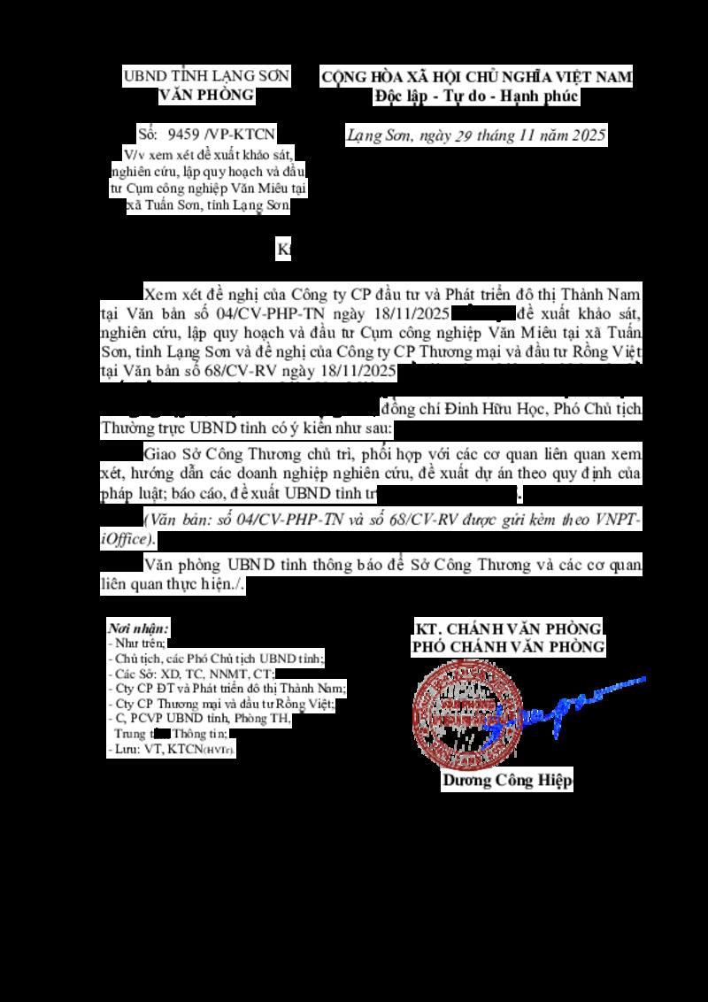 | Tiêu đề văn bản | V/v xem xét đề xuất khảo sát, nghiên cứu, lập quy hoạch và đầu tư Cụm công nghiệp Văn Miêu tại xã Tuấn Sơn, tỉnh Lạng Sơn | ||