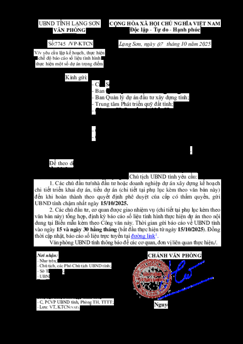 Tiêu đề văn bản | V/v yêu cầu lập kế hoạch, thực hiện chế độ báo cáo số liệu tình hình thực hiện một số dự án trọng điểm | ||