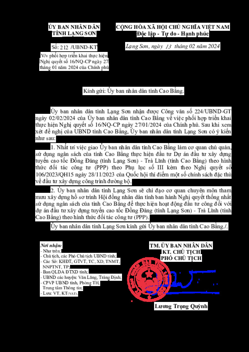 | Tiêu đề văn bản | Về việc phối hợp triển khai thực hiện Nghị quyết số 16/NQ-CP ngày 27 tháng 01 năm 2024 của Chính phủ | ||